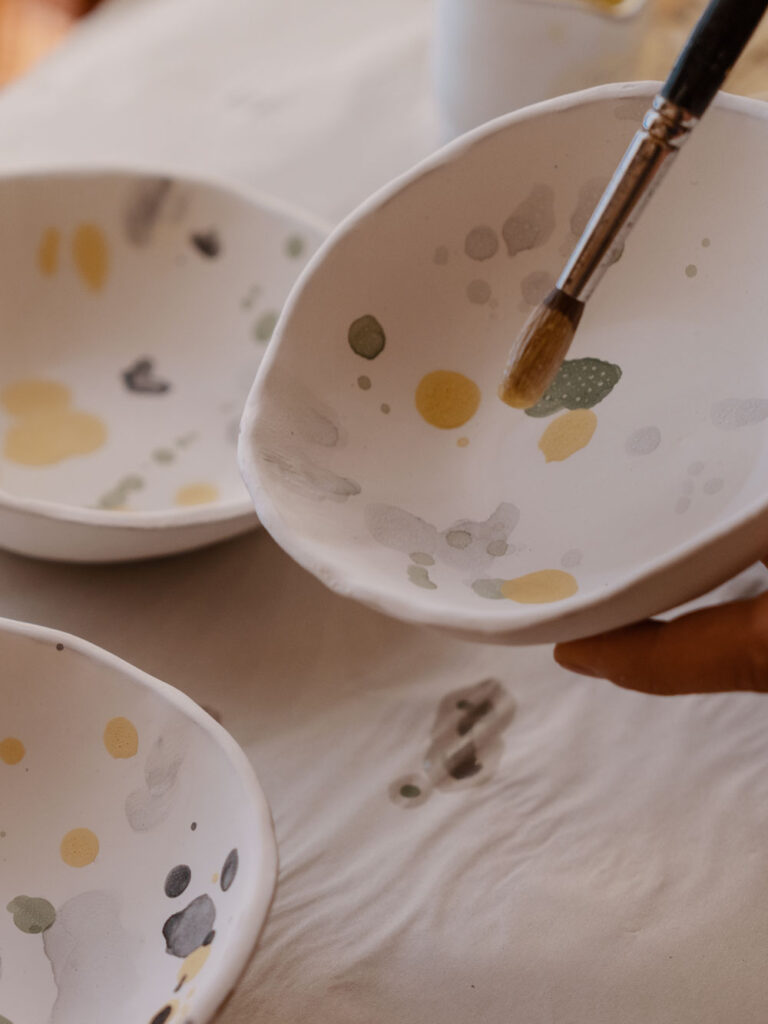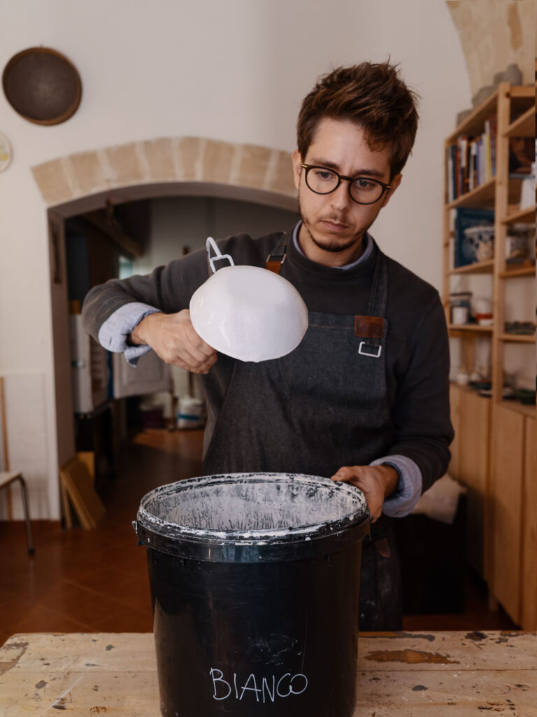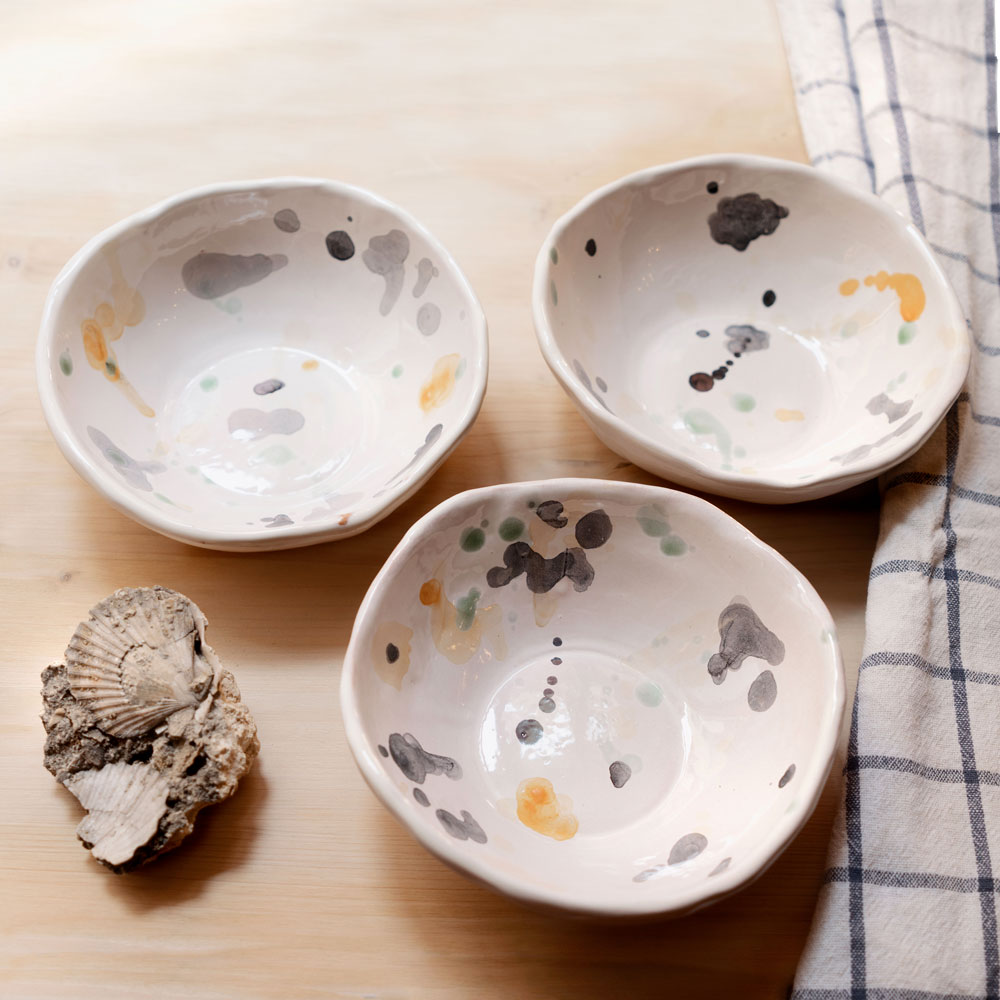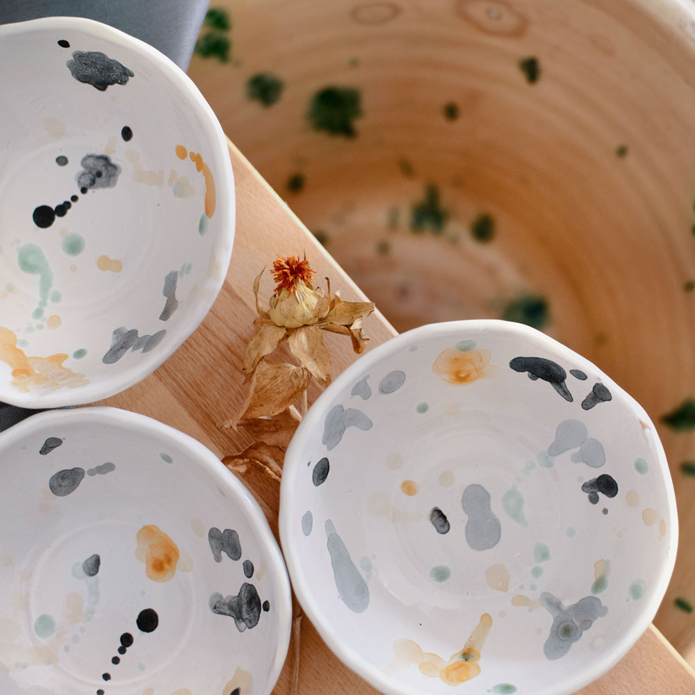 Perpetuando la tradizione delle ceramiche pugliese schizzate con la cristallina verderame, realizziamo queste ciotole ispirate alle rocce calcaree dell’Alta Murgia.