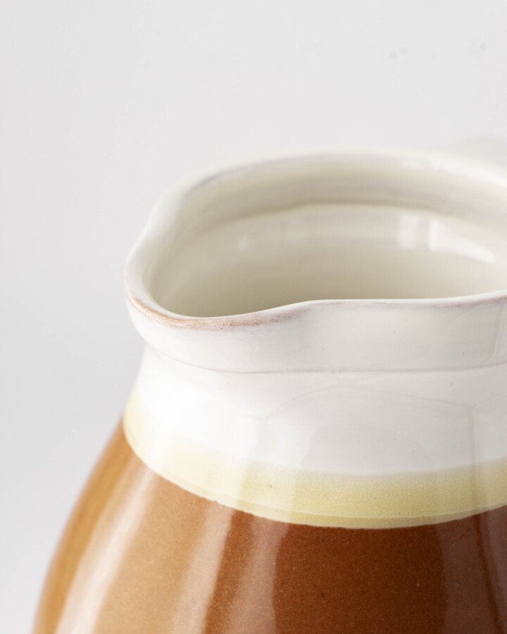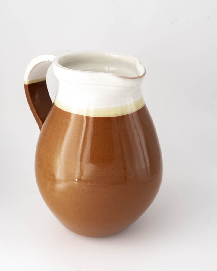 Riprendono le forme magno-greche e quelle della tradizione contadina appulo-lucana questa brocca dalle forme globulari a unica ansa ricorda l’aryballos dell’antica grecia. Modellata al tornio a mano e smaltata con smalti e cristalline lucide senza piombo, questa brocca ha una capacita di circa 1,1 Le può essere lavata in lavastoviglie
