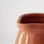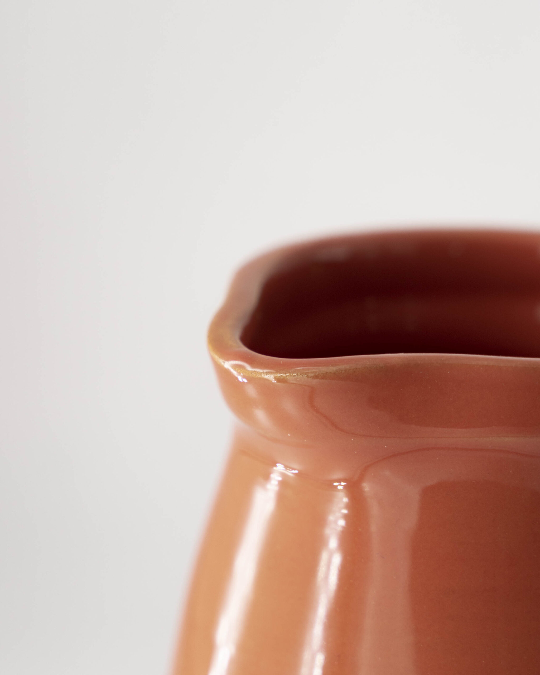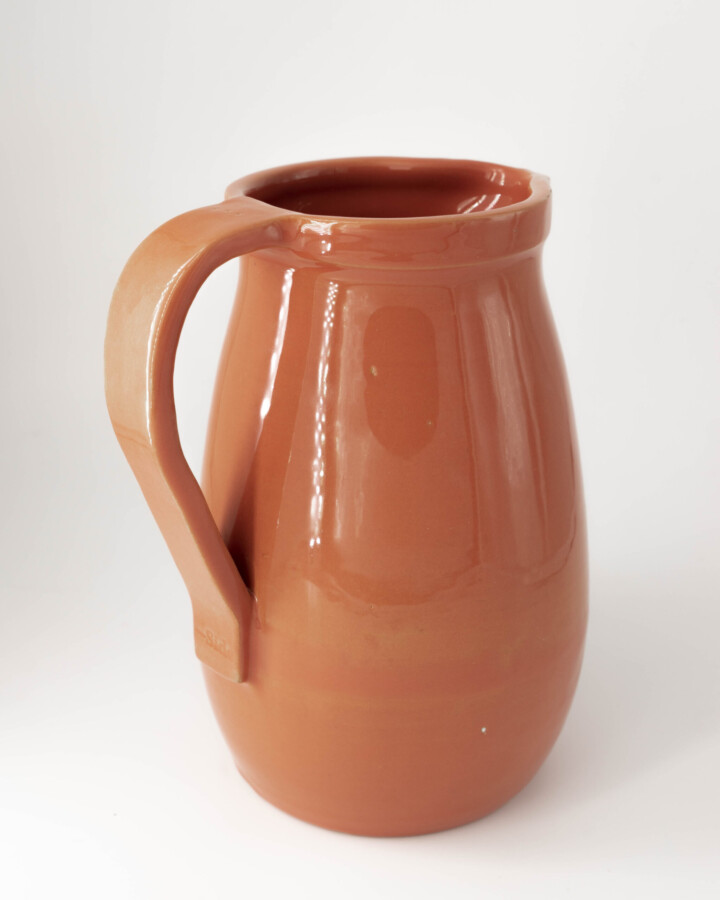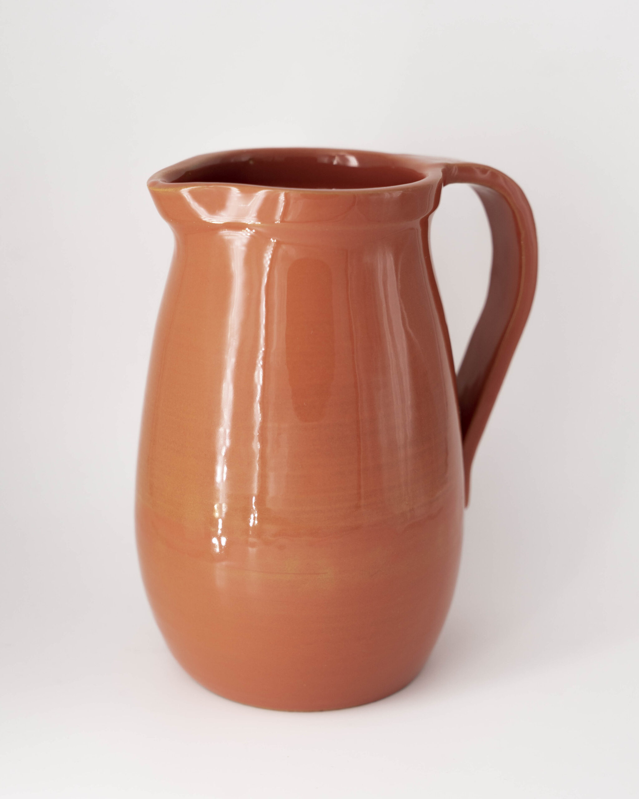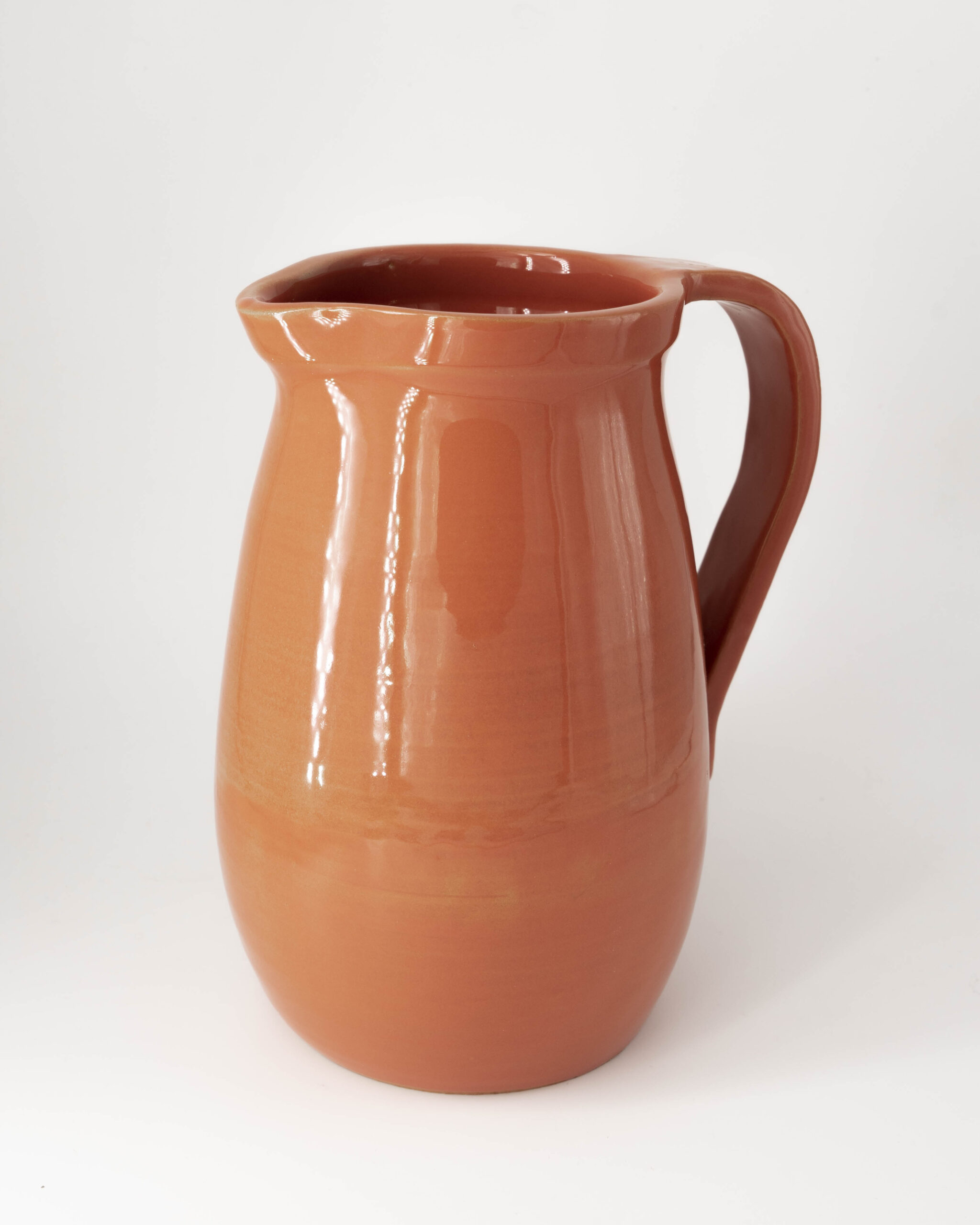 Brocca in terracota smaltata con smalto lucido privo di piombo. Interamente realizzata a mano in tutte la sue fasi, dalla foggiatura al tornio fino alla smaltatura, la brocca ha un capacità pari a circa 1,1L.