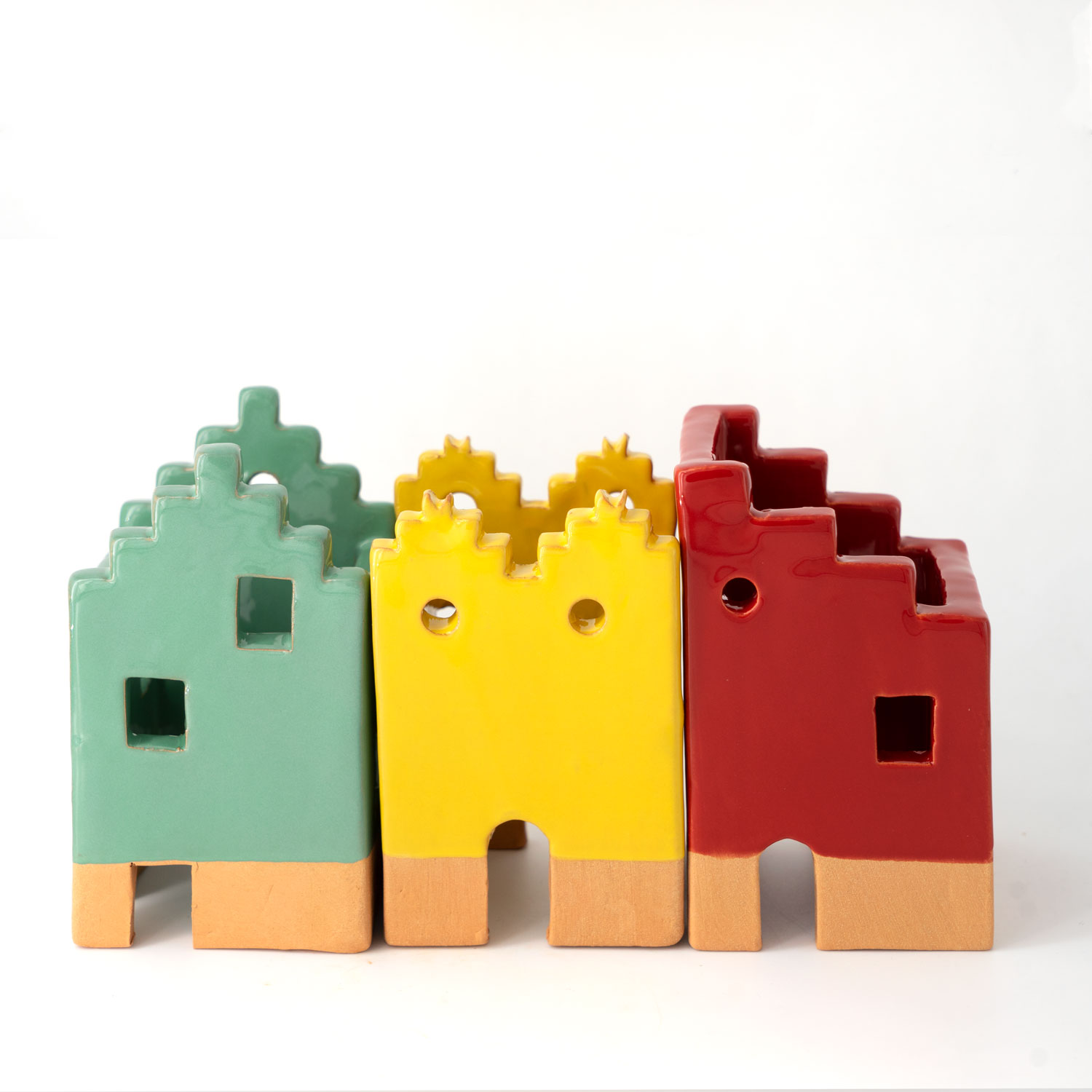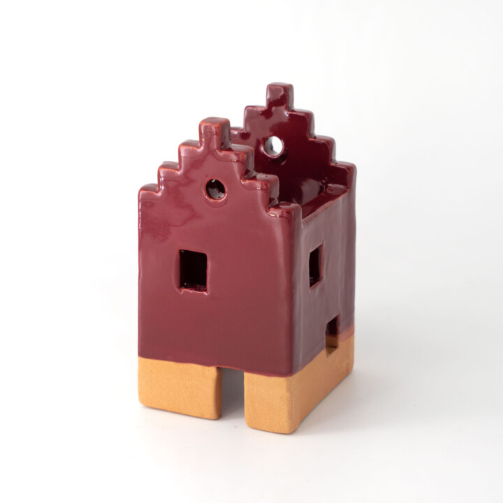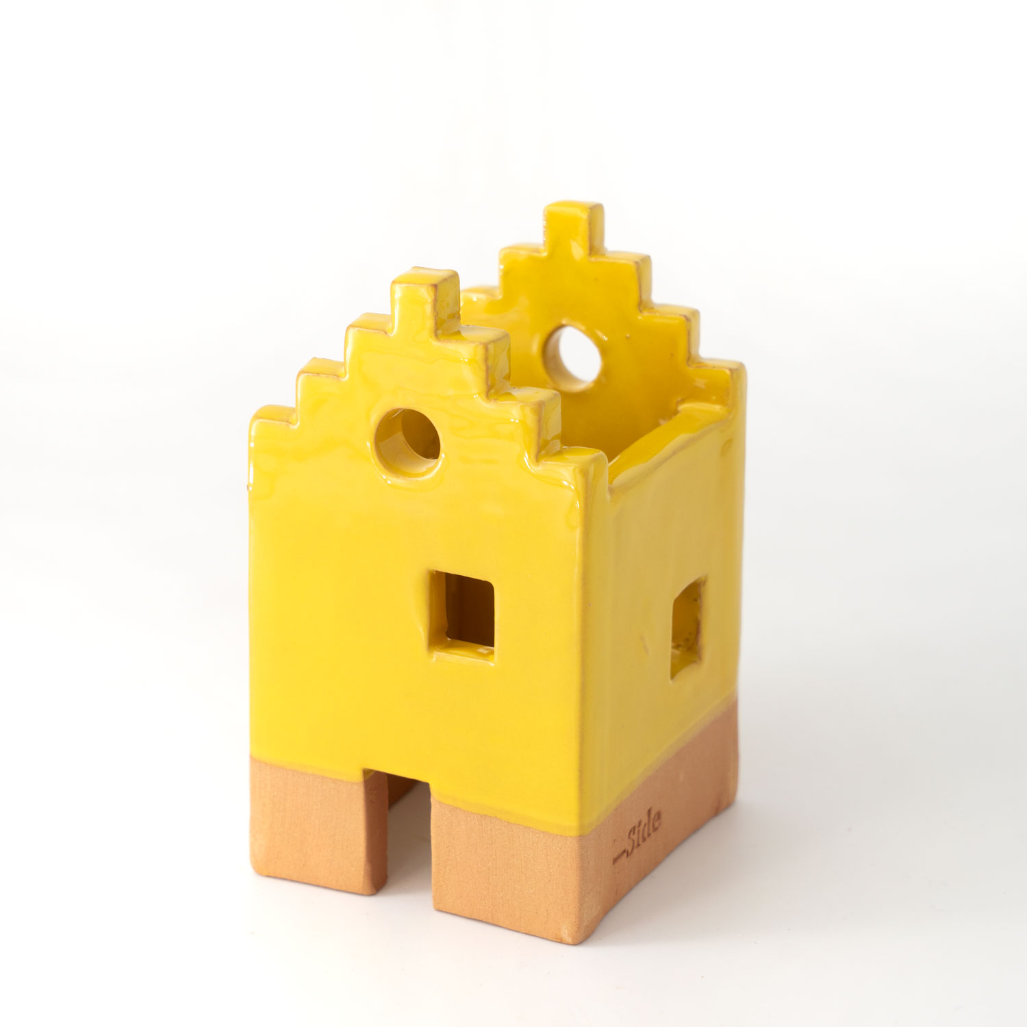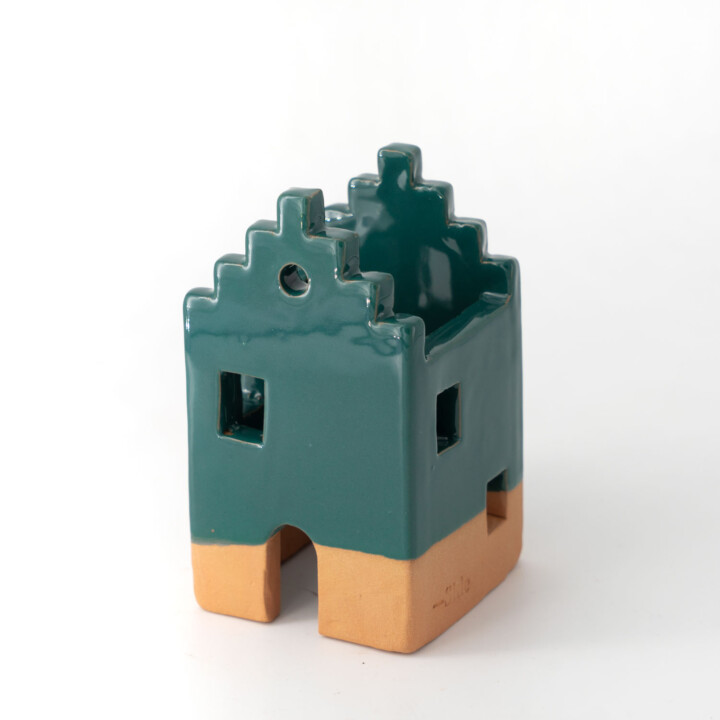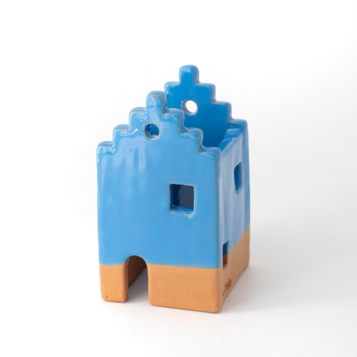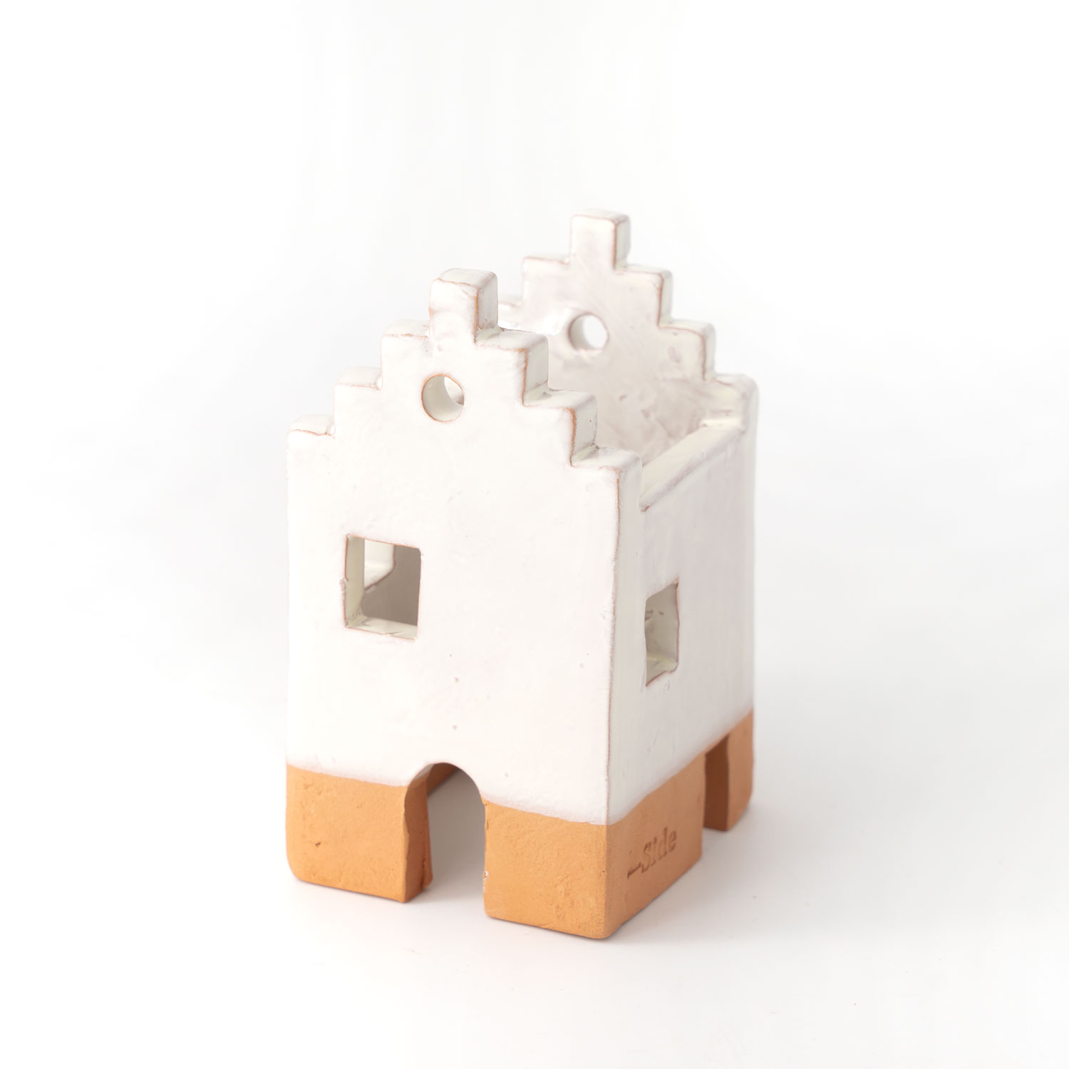 Modellare l’argilla rappresenta una via di narrazione del territorio in cui viviamo, un approccio multidisciplinare che coinvolge arte, architettura, sociologia, design. Realizzate a mano in tutte le fasi, le casette portacandela sono ispirate alle umili abitazioni contadine dei Sassi di Matera dichiarati Patrimonio Mondiale dell’Umanità dall’UNESCO, con il loro caratteristico profilo scalettato che in facciata definisce forse l’unico vero decoro funzionale a mascherare le falde del tetto.