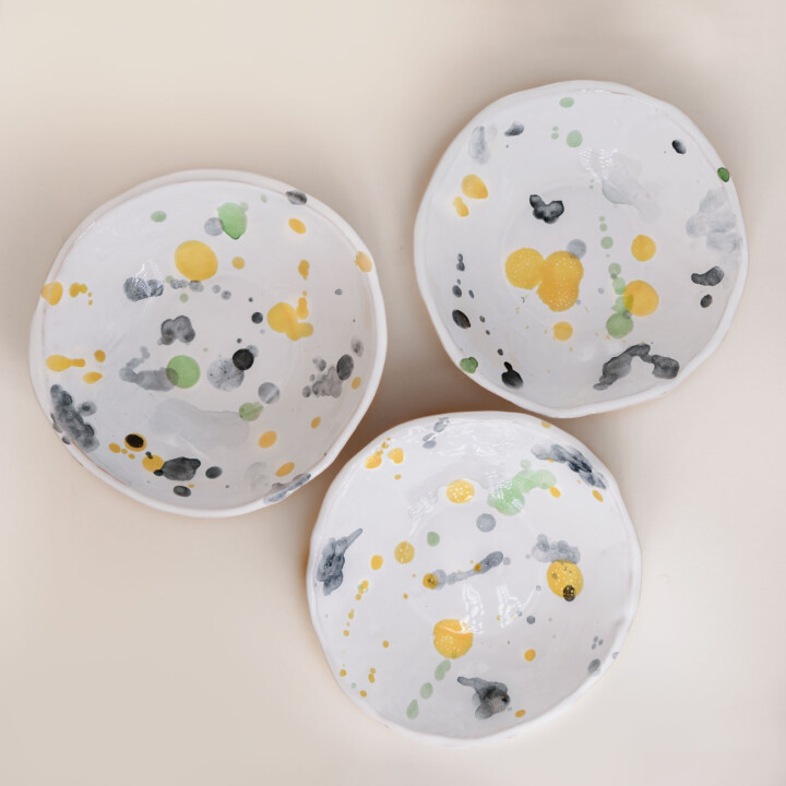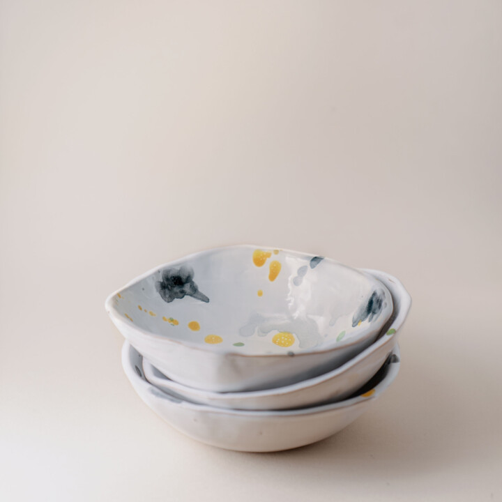 Perpetuando la tradizione delle ceramiche pugliese schizzate con la cristallina verderame, realizziamo queste ciotole ispirate alle rocce calcaree dell’Alta Murgia. Frutto di una geniale simbiosi tra un’alga e un fungo, il lichene ha rappresentato una via di narrazione delle nostre pietre calcaree rivisitando il tradizionale metodo di decorazione delle ceramiche smamriate