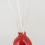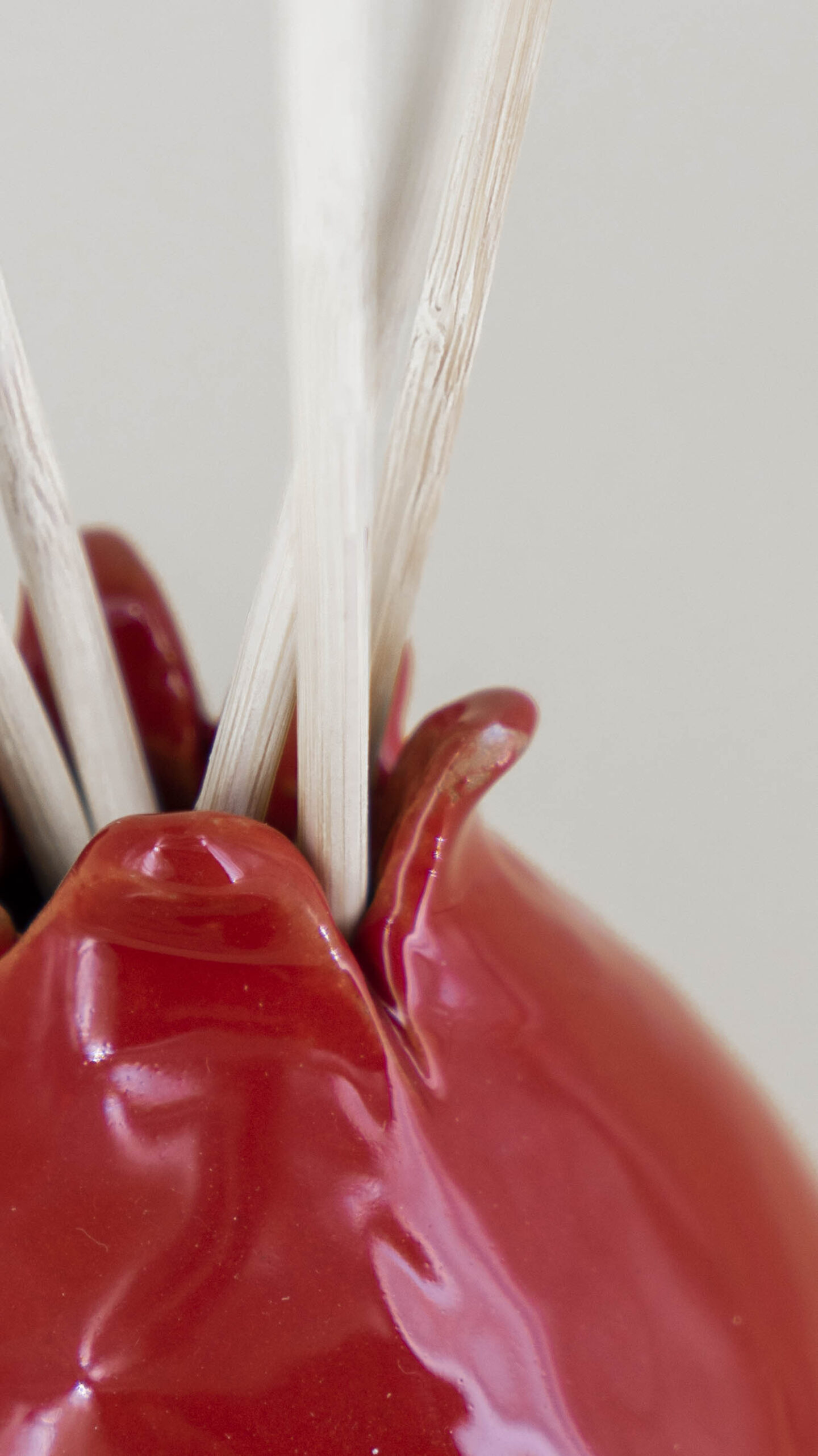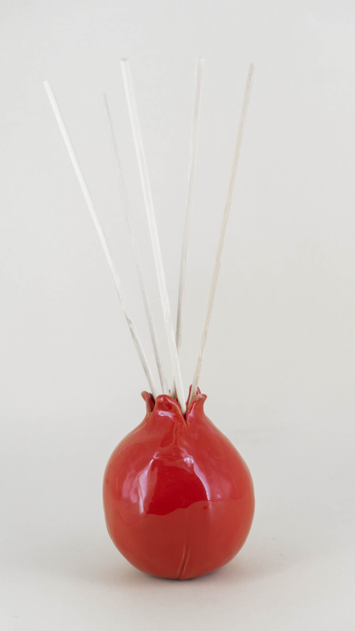 Malum Granatum, la mela con i semi rosso rubino. La sua corazza sfumata dal giallo al rosso intenso protegge al suo interno i chicchi aciduli tenuti insieme stretti stretti. Abbiamo pensato con questo frutto che così tanto ci rappresenta, di tenere ben chiusa la sua corazza e aprirne come una corona la parte alta e da li far uscire bastoncini in legno di bambù idonei a diffondere le tue fragranze preferite.